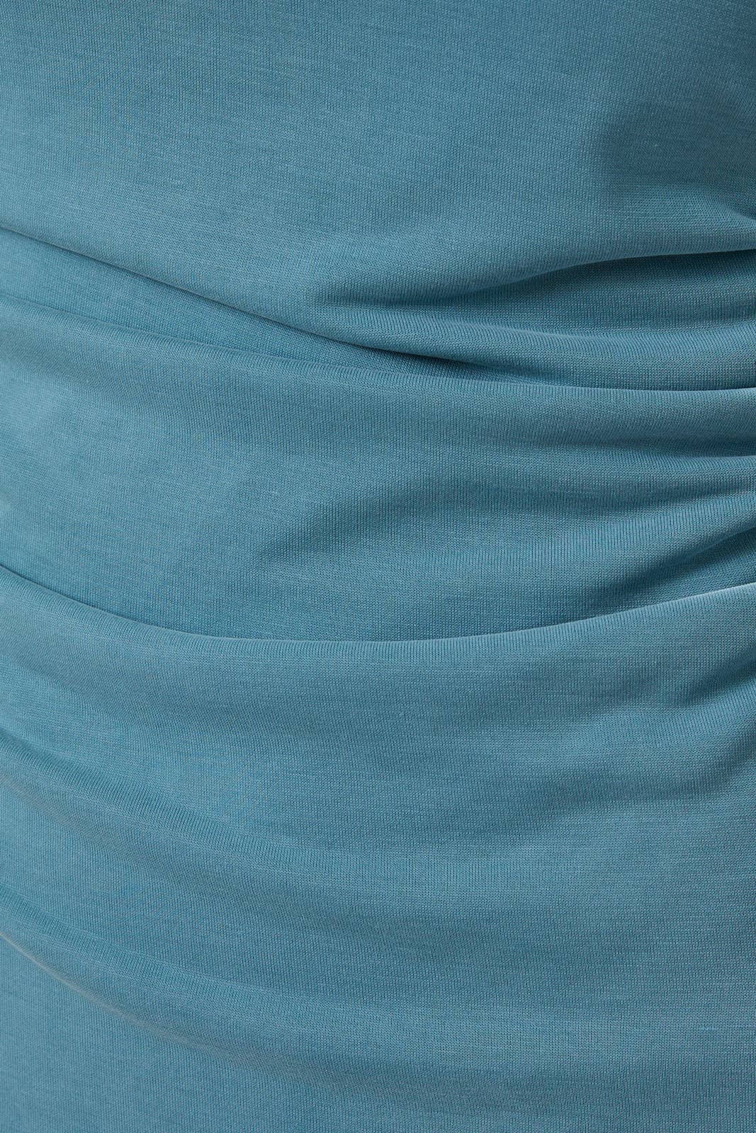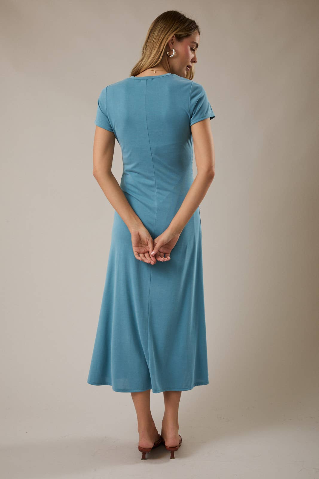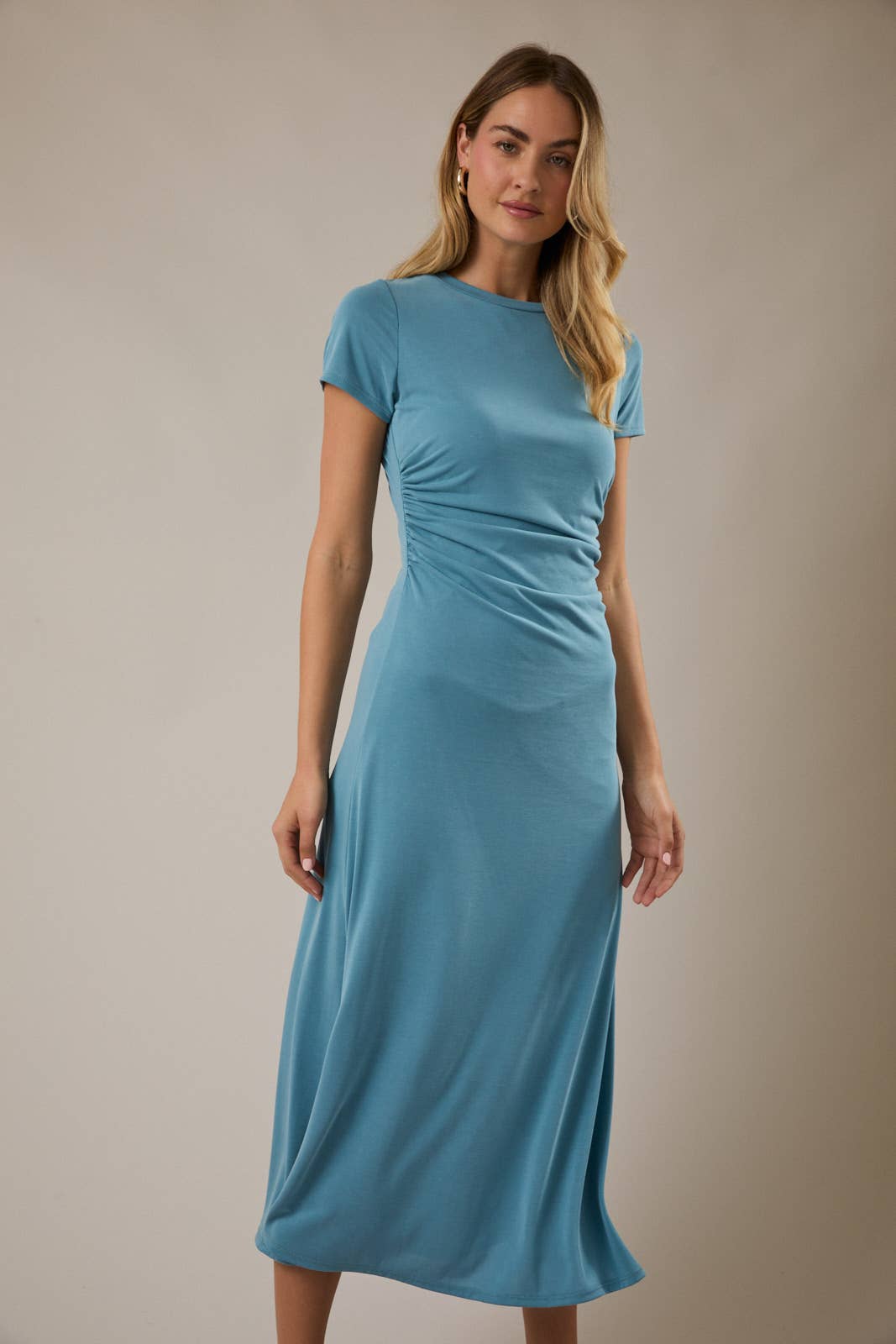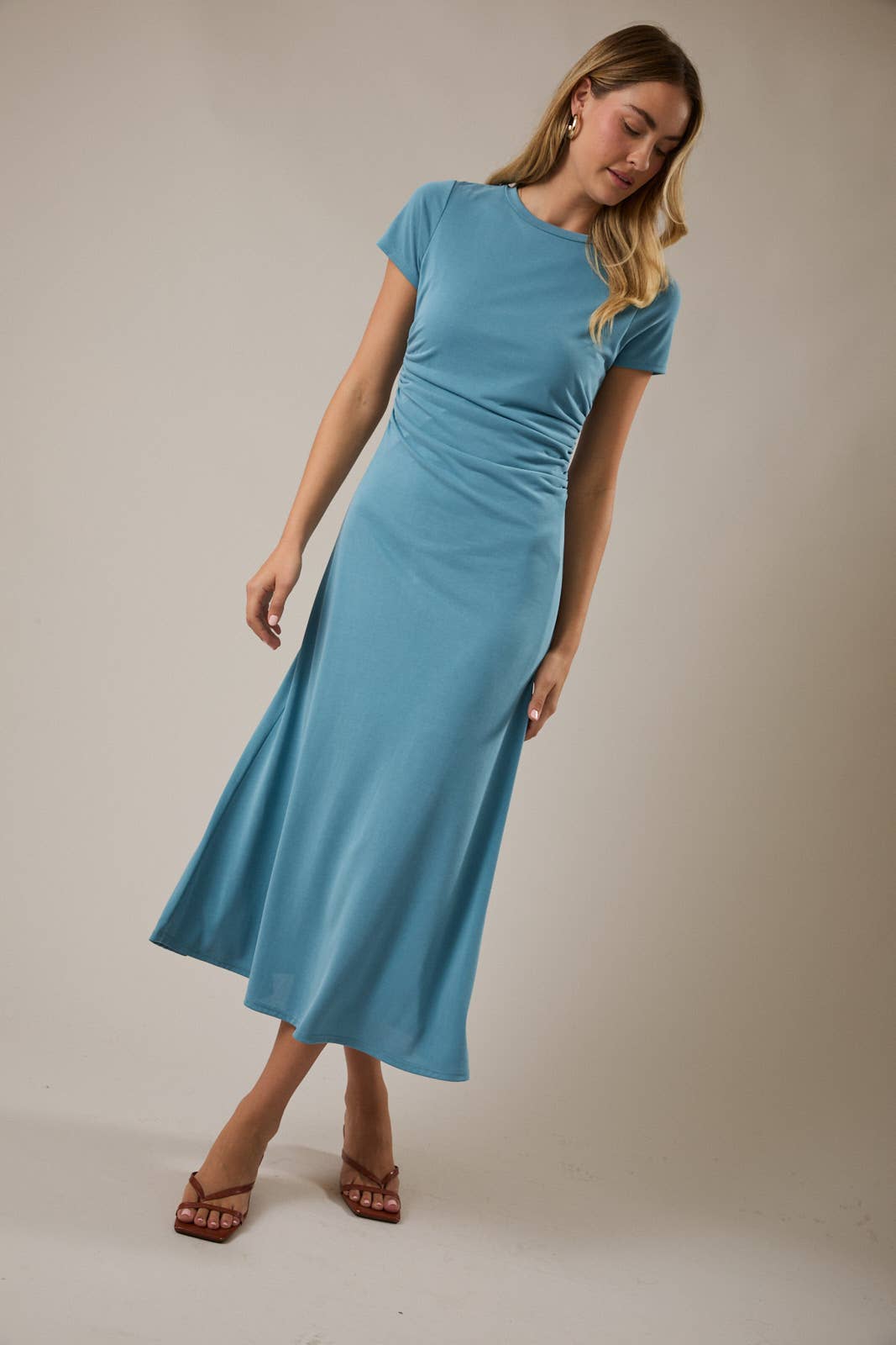 CREW NECK SHORT SLEEVE FRONT WAIST RUCHED MIDI DRESS