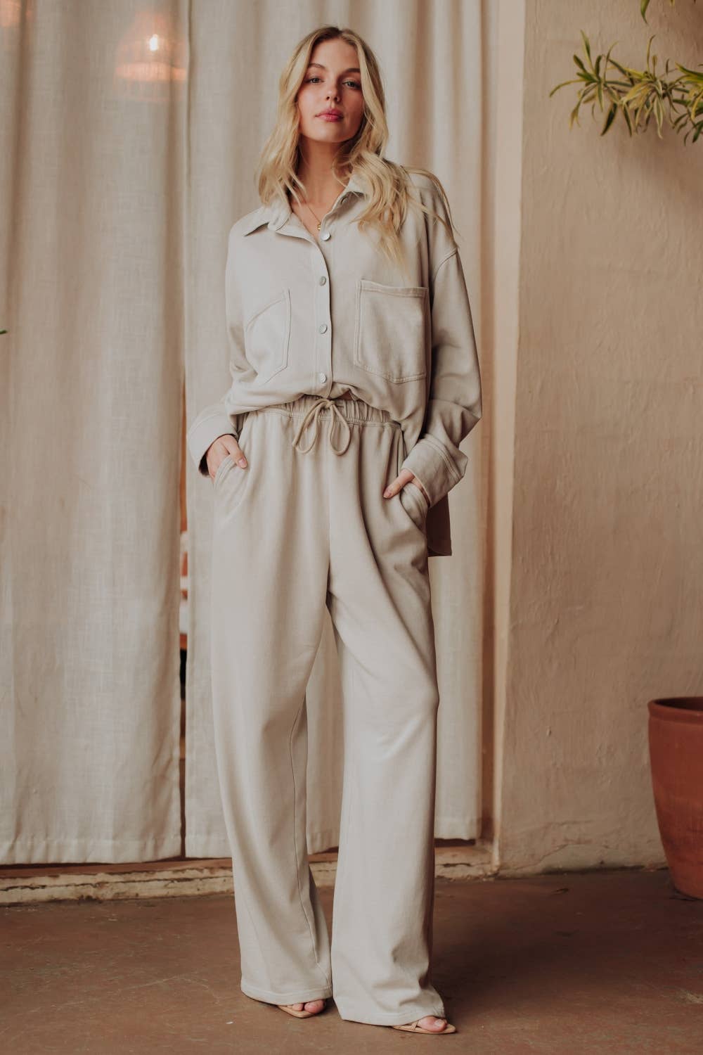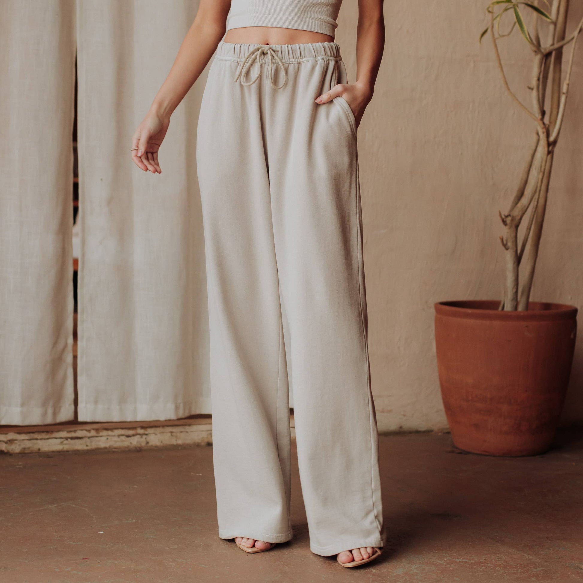 Light gray washed soft sweatpants designed with a relaxed, wide-leg fit, elastic waistband with drawstring, and an ultra-comfortable feel for effortless everyday wear. Perfectly pairs with the Lt. Gray Washed Soft Button Up. 60% Cotton, 40% Polyester