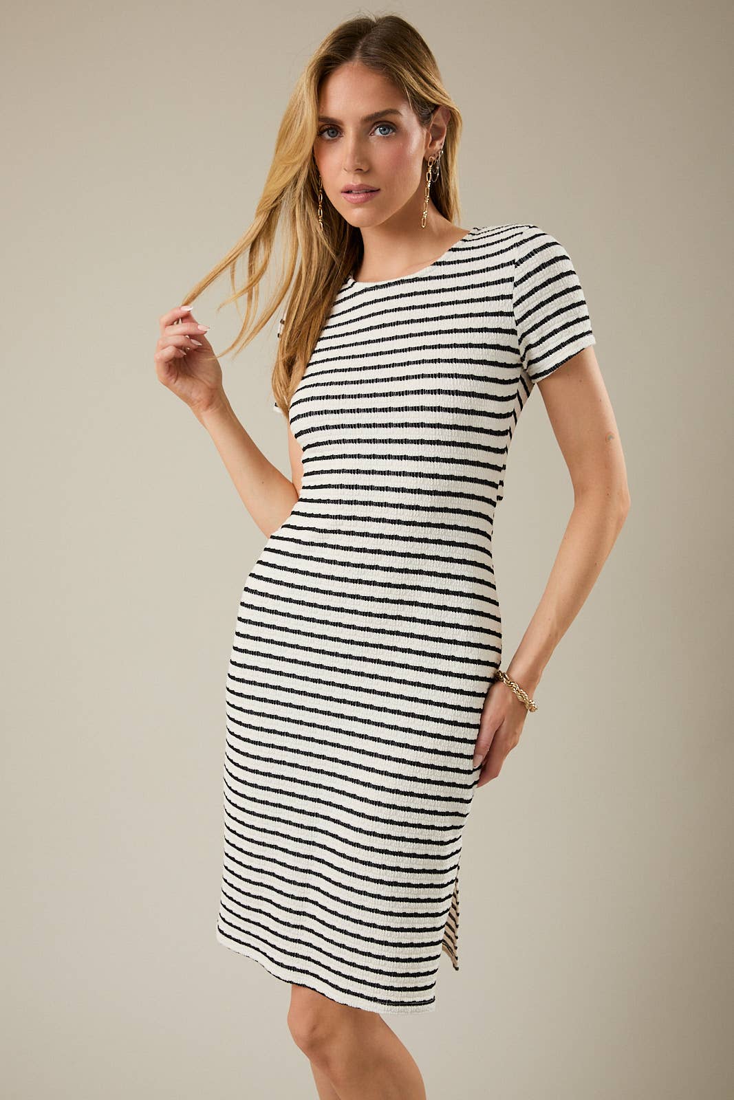 SHORT SLEEVE BACK CUT-OUT SIDE SLIT STRIPE MIDI DRESS
