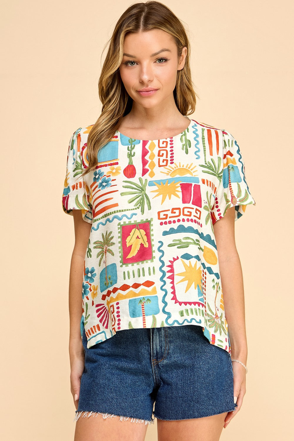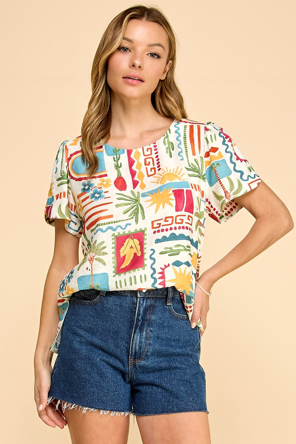 This vibrant, short-sleeved blouse is a captivating piece designed to inject a dose of playful artistry into any wardrobe. Crafted from a lightweight, breathable fabric, it offers exceptional comfort for warmer days and a relaxed silhouette that drapes beautifully. The standout feature is its unique, all-over print, resembling a collage of colorful postage stamps, each depicting whimsical scenes of tropical foliage, bright suns, and abstract motifs. The design evokes a sense of wanderlust and carefree spirit, making it perfect for vacations, beach outings, or simply adding a cheerful touch to everyday ensembles. The neckline is a classic boat neck, offering a flattering and modest frame, while the short, slightly puffed sleeves add a subtle feminine detail. This blouse effortlessly pairs with denim skirts, shorts, or linen trousers, creating a look that is both stylish and effortlessly cool. It's a versatile piece that can be dressed up or down, embodying a modern bohemian aesthetic with a touch of artistic flair. The rich color palette, featuring bold reds, sunny yellows, ocean blues, and lush greens, ensures it will be a focal point of any outfit. This top is an ideal choice for those who appreciate unique prints and want to express their personality through their clothing. It's a celebration of color and design, promising to brighten your day and elevate your style. The fabric's soft hand-feel and airy quality make it a pleasure to wear, ensuring you stay comfortable and chic throughout the day. The playful yet sophisticated print makes it a true conversation starter.