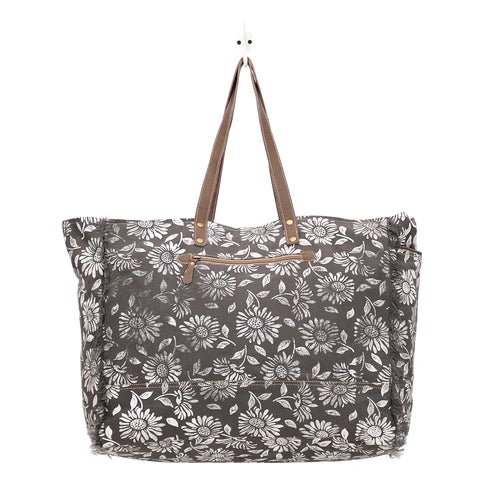 Effortlessly stylish and spacious enough for all your travels, this floral canvas bag with a premium front leather panel exudes an eye-catching, elegant charm. Crafted from upcycled canvas with a magnificent flower-printed cotton design, it combines functionality with Western flair. The Myra canvas bag also features two side water bottle pockets, and an inside zipper pocket, perfect for your family adventures or long getaways. What’s more, a fringe accent adds boho chic to this standout weekender bag for women.
