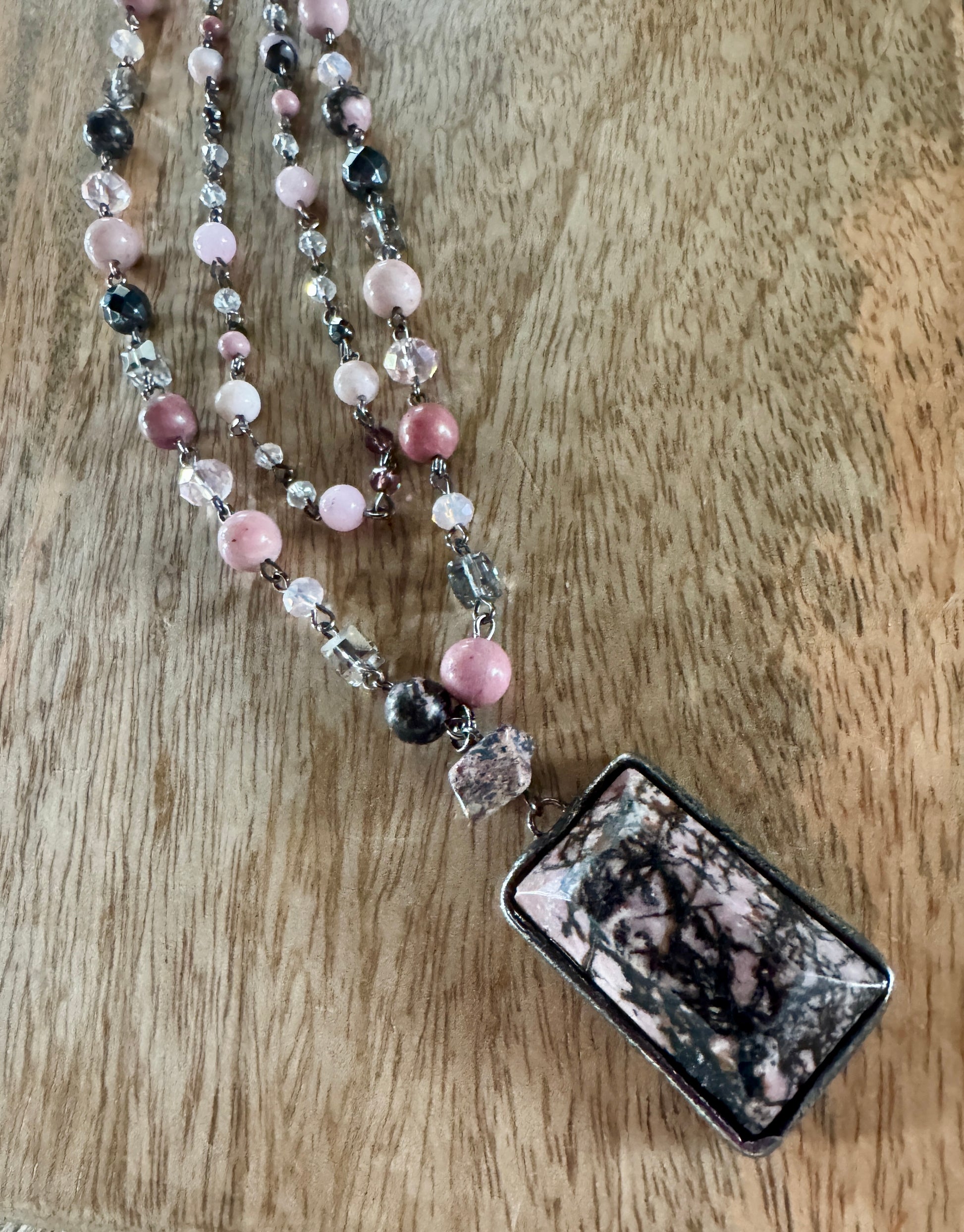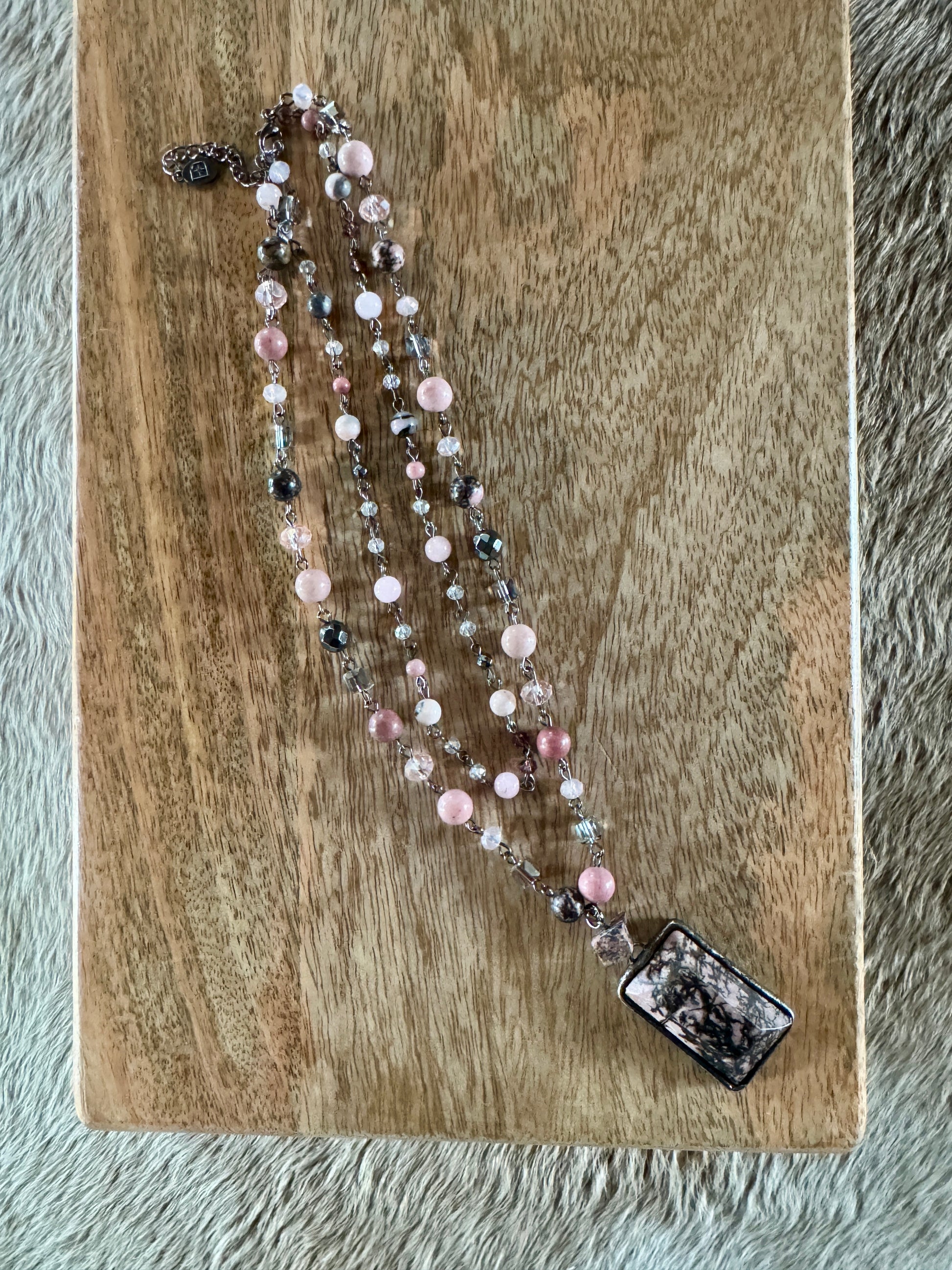 Multi-strand necklace with adjustable lobster claw closure and 2" extension. Each strand is a beaded chain link. The longer strand has a soldered rectangle stone pendant.
