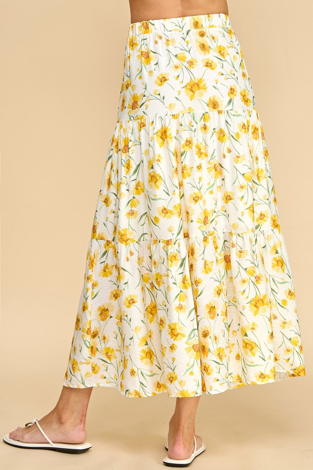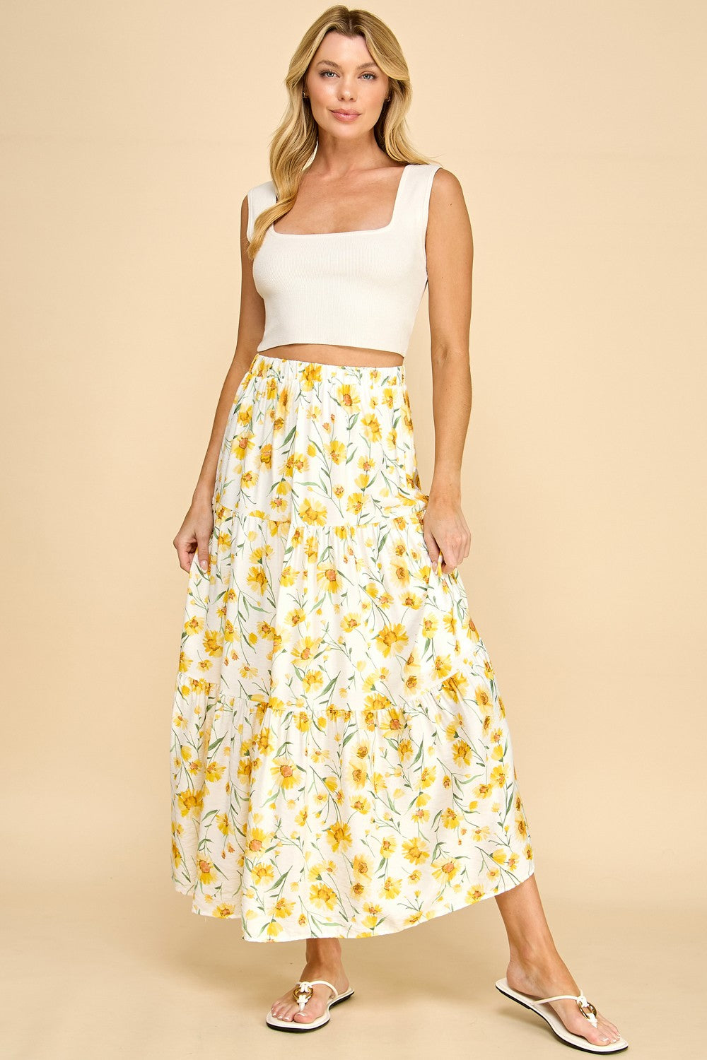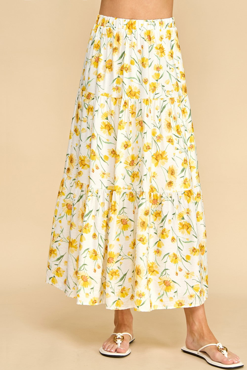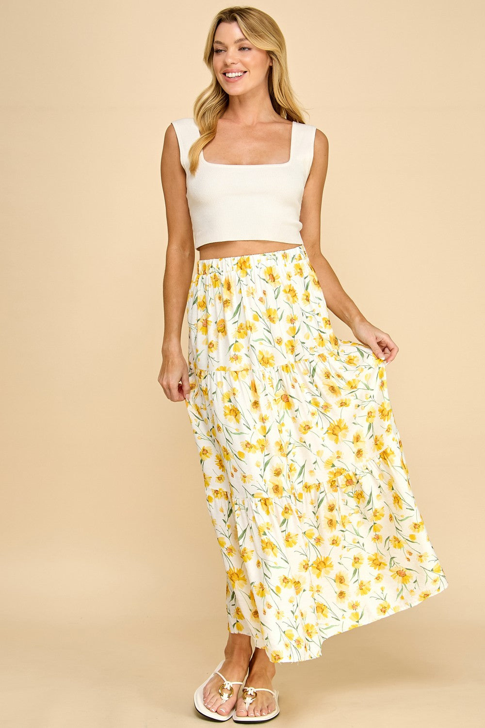 Embrace effortless summer style with this enchanting tiered maxi skirt, adorned with a vibrant yellow floral print on a crisp white background. The flowy silhouette and tiered design create a beautiful, bohemian-inspired look that's perfect for any warm-weather occasion. Crafted from a lightweight, breathable fabric, this skirt offers ultimate comfort and graceful movement. The high-waisted cut accentuates your figure, while the generous length provides a sophisticated and elegant aesthetic. This versatile piece can be dressed up or down, making it a staple for your vacation wardrobe, garden parties, or casual day outs. Pair it with a simple crop top or a fitted blouse for a chic ensemble, or layer it with a denim jacket for a touch of laid-back cool. The playful floral pattern evokes a sense of carefree joy and feminine charm, reminiscent of sunny days and blooming meadows. Its vintage-inspired aesthetic adds a touch of timeless appeal, ensuring it remains a favorite for seasons to come. Whether you're strolling along the beach, enjoying a picnic in the park, or attending a special event, this maxi skirt promises to make a stylish statement. The tiered construction adds a touch of whimsical flair, allowing the fabric to cascade beautifully with every step. This skirt is an ode to natural beauty and relaxed elegance, designed for the modern woman who appreciates both comfort and style. Its adaptability makes it suitable for various settings, from casual brunches to more formal gatherings, simply by changing your footwear and accessories. The subtle details, like the delicate floral motif, contribute to its overall charm and appeal, making it a truly captivating addition to any fashion-forward collection. It's the quintessential piece for anyone looking to capture the essence of summer fashion with a touch of bohemian spirit and timeless grace.